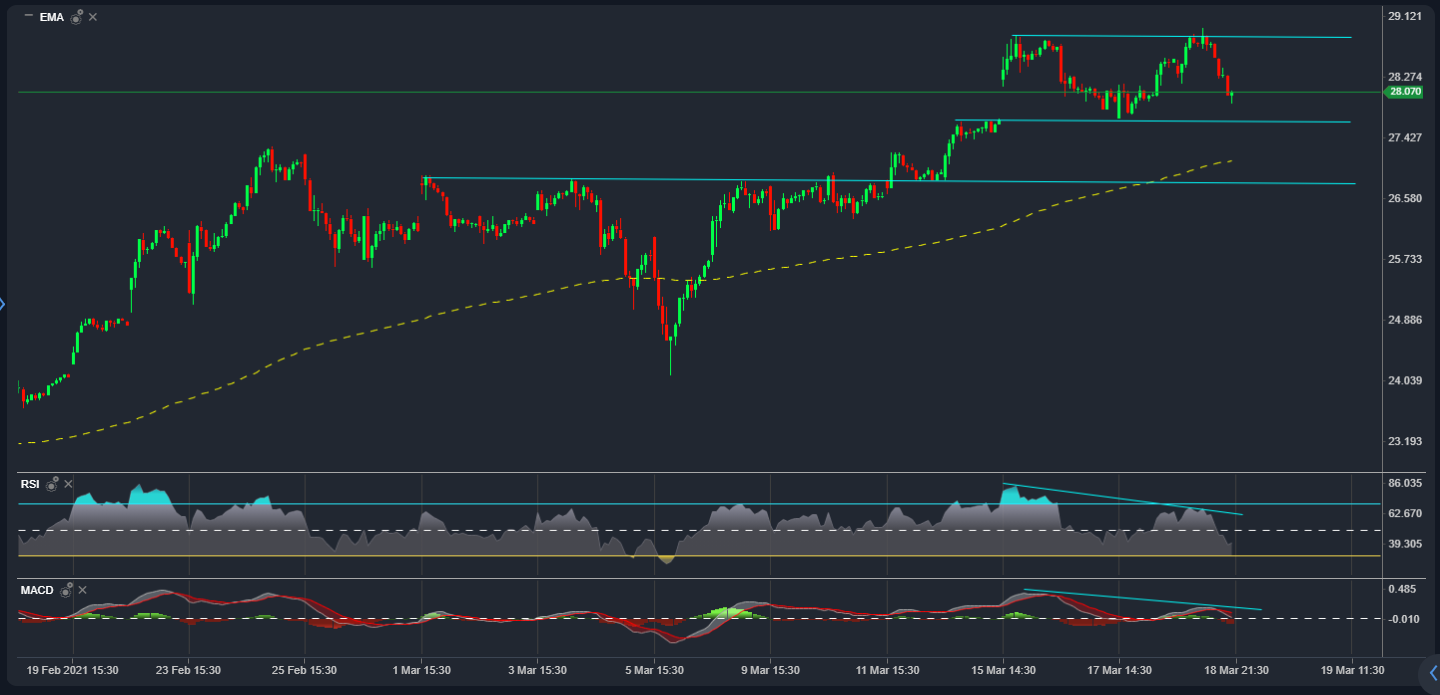DIA continua una clara tendencia alcista hasta alcanzar un máximo sobre 332.84 donde empieza a mostrar señales de divergencia lo que podría estimar un posible retroceso por la tanto una ruptura sobre el soporte 328.02 podría estimar una continuidad bajista.