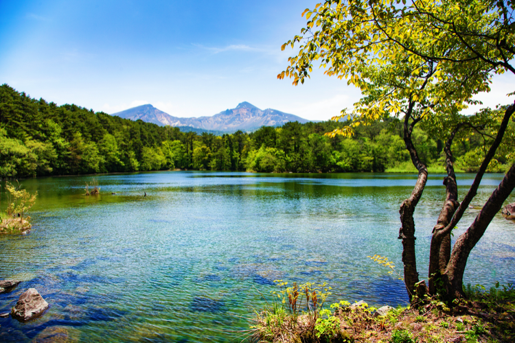 Japan Mount Bandai with lake and tree in Springtime