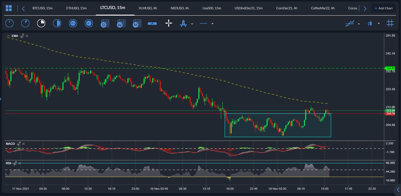 LTC cotiza cerca de la EMA de 200 periodos en gráficos de 15M y al igual que ETH y BTC la criptomoneda se muestra agotada sobre su caída en la última semana y podría atraer la mirada de los operadores contra tendenciales en búsqueda de tomar posiciones en favor de las compras.