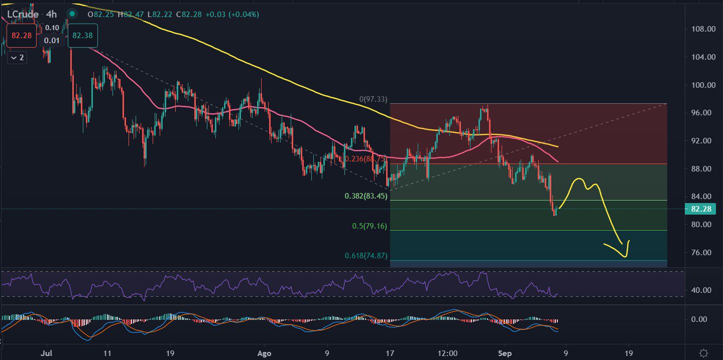 Con el precio alcanzando el soporte sobre 81.12 podría estimarse un movimiento de corrección alcista hacia la resistencia 88.75, para nuevamente darse una continuidad en favor de los vendedores en la búsqueda de nuevos objetivos hacia los soportes 79.16 y 74.87, niveles de extensión de Fibonacci.