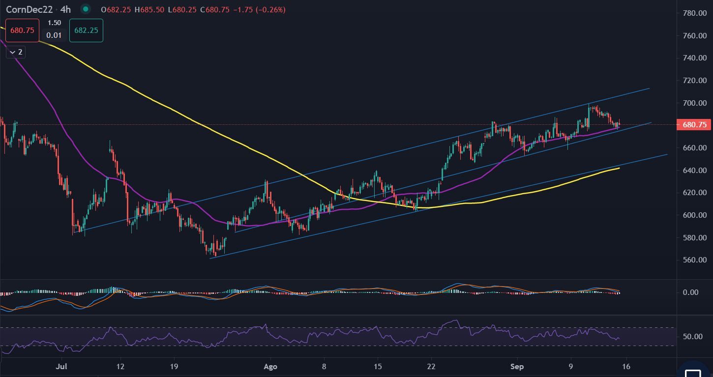 Comentario: Los futuros del maíz han estado al alza desde sus mínimos en julio, repuntando desde los 564 hasta el máximo de 697 alcanzado el 12 de septiembre, día en que el USDA publicó su informe de estimaciones de la oferta y la demanda agrícola mundial (WASDE), donde proyecta una disminución en la cosecha y el suministro de maíz y soja para septiembre.
