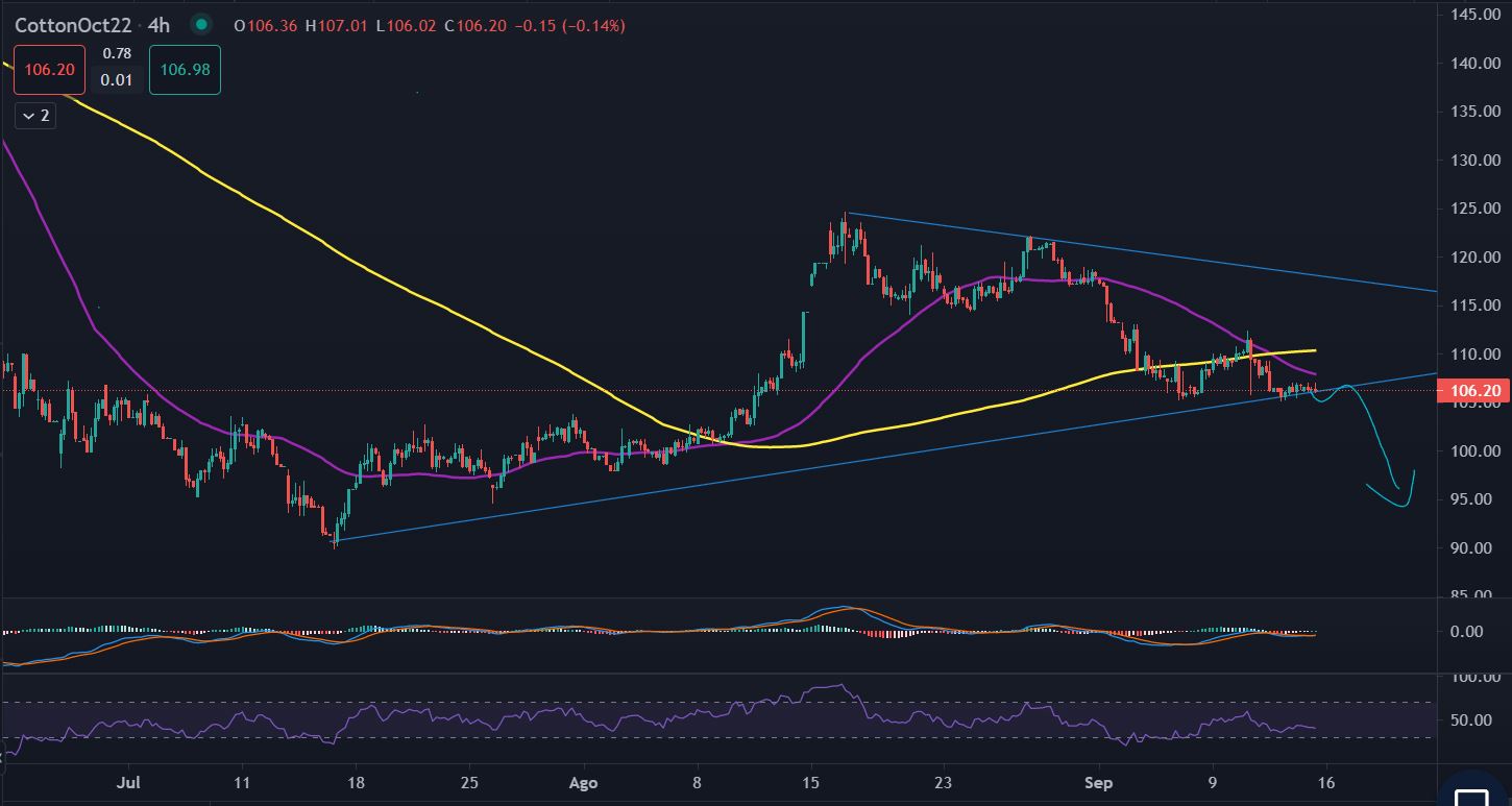 La caída de los precios ha llevado al COTTON a cotizar por debajo de la MM de 200 periodos en gráfico de 4H, encontrando apoyo sobre el soporte 104.83. Si el precio logra vencer esta zona los vendedores podrían continuar en control e ir a buscar la ruptura sobre el soporte psicológico de 100 para continuar su recorrido hacia los mínimos de julio en 90.14.