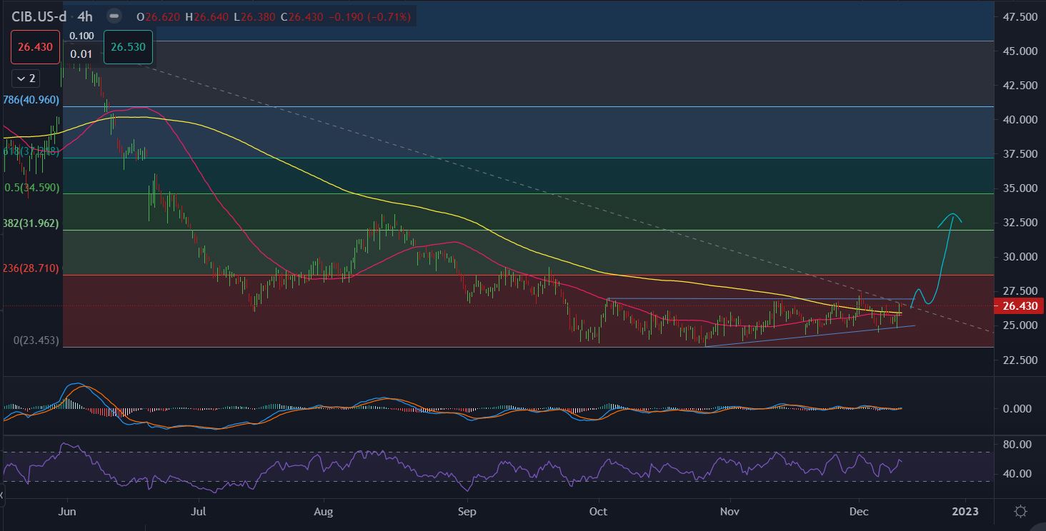 Comentario: Bancolombia S.A. (CIB) ofrece productos y servicios bancarios en Colombia, Panamá, Puerto Rico, El Salvador, Costa Rica y Guatemala.  Bancolombia al igual que otras empresas colombianas como el Grupo Aval y Ecopetrol, cotizan en la Bolsa de Valores de Nueva York (NYSE) a través del sistema “Recibo del Depositario Americano” (ADR) y podría resultar una buena oportunidad si operas en el corto plazo si operas con CFD´s.