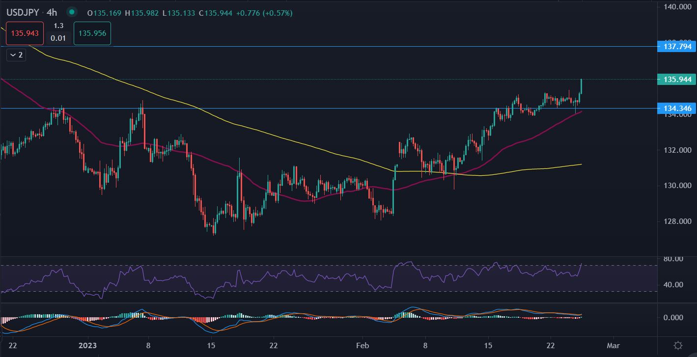 En cuanto a la paridad USDJPY, esta se mantiene en una tendencia alcista en los gráficos de 4H, acercándose al objetivo de 137.79. La debilidad del yen podría mantenerse con la llegada de nuevos datos económicos que no mejoren la percepción de la economía japonesa en el corto plazo.