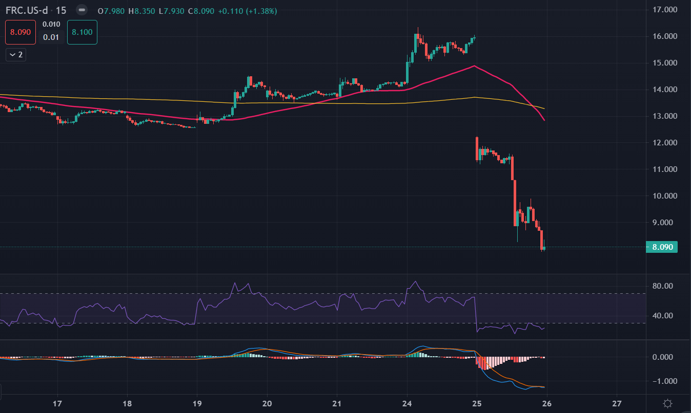 Comentario: First Republic (FRC) publicó sus resultados trimestrales este martes. El banco sorprendió a los inversores y analistas al revelar una salida de más de 100 mil millones de dólares en depósitos en marzo.