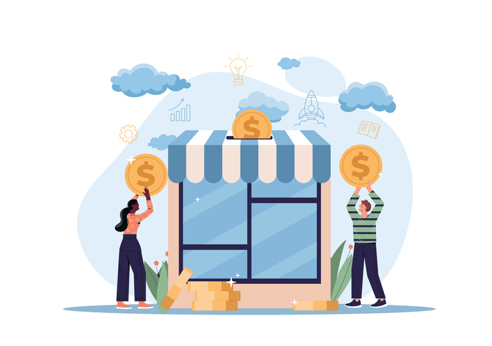 Financing business concept. Man and girl with coins in their hands. Investors and investments, financial literacy, small business support. Sources of company income. Cartoon flat vector illustration