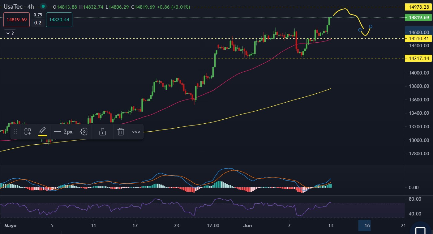 Sin embargo, es importante tener en cuenta que los altos niveles de sobrecompra en el NASDAQ 100 podrían anticipar una toma de ganancias antes de que el índice alcance la resistencia clave en los 14,973 puntos. Esto podría deberse a una anticipación de los inversores a los resultados fundamentales que se espera que sean favorables durante la semana.