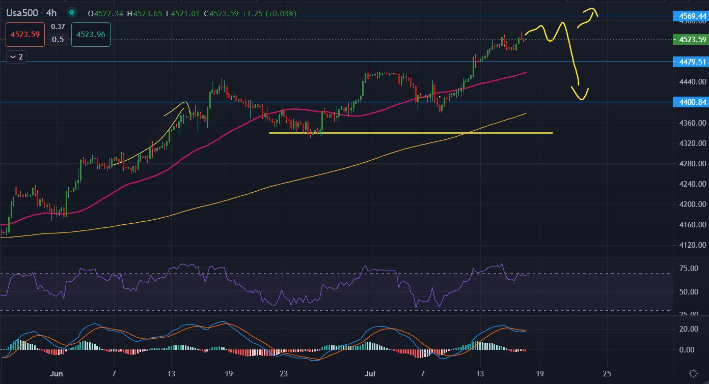 Comentario: La semana en Wall Street inicia con el S&P500 al alza, cotizando cerca de la zona de los 4,500 puntos, manteniéndose sobre niveles de sobrecompra en gráficos de 4H y mostrando una alta probabilidad de que los compradores busquen una toma de ganancias.
