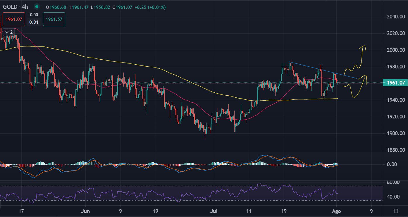 El oro ha superado la media móvil de 200 periodos y mantiene su tendencia alcista, pero muestra debilidad y podría buscar soporte en 1940 antes de seguir subiendo. Los compradores buscan romper la resistencia en 1,976. Datos de empleo en EE.UU. serán clave.