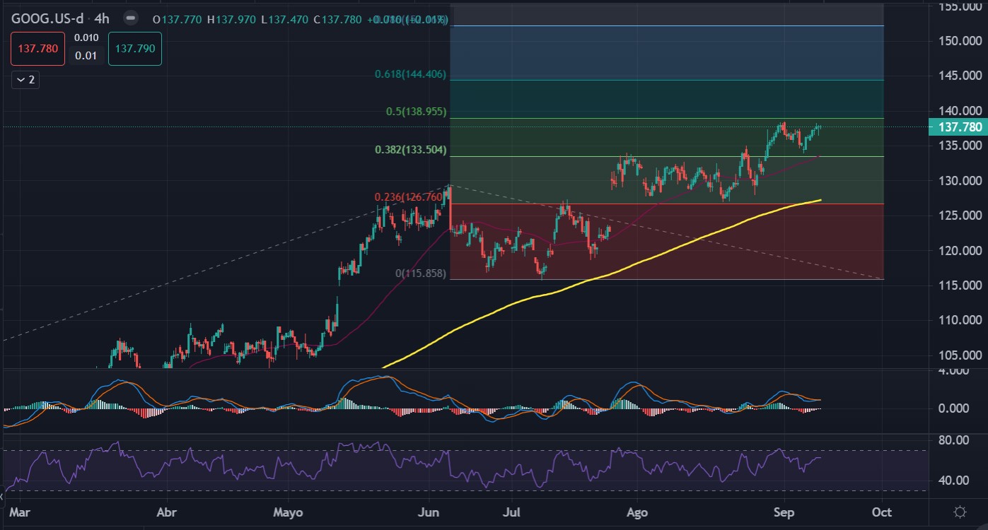 Por su parte la acción de Google se mantiene sobre un movimiento de tendencia alcista que muestra un RSI muy cerca de niveles de sobrecompra y un MACD con señales de divergencia que pueden alertar a los compradores a la búsqueda de una toma de ganancias. Los niveles más importantes a considerar se ubican sobre la resistencia 152.11 y el soporte 126.76. A medida que se divulgue más información sobre el juicio los operadores podrían buscar oportunidades sobre la acción.