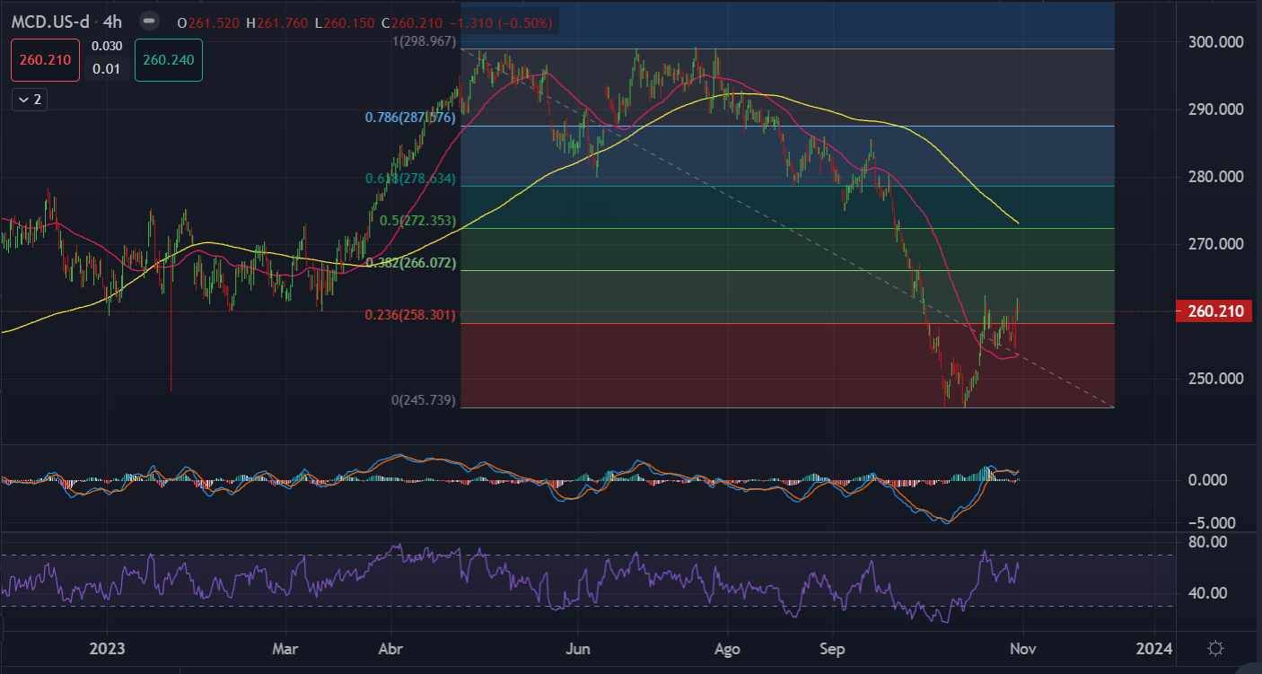 Comentario: McDonald’s (MCD) publicó sus resultados trimestrales antes de la apertura del mercado el día lunes, superando las expectativas de Wall Street. Las ganancias por acción alcanzaron $3.19, un incremento del 19% en comparación con el mismo trimestre del año anterior, superando las estimaciones que apuntaban a $3 por acción. Los ingresos aumentaron un 14% a $6.69 mil millones, superando las previsiones de $6.58 mil millones.