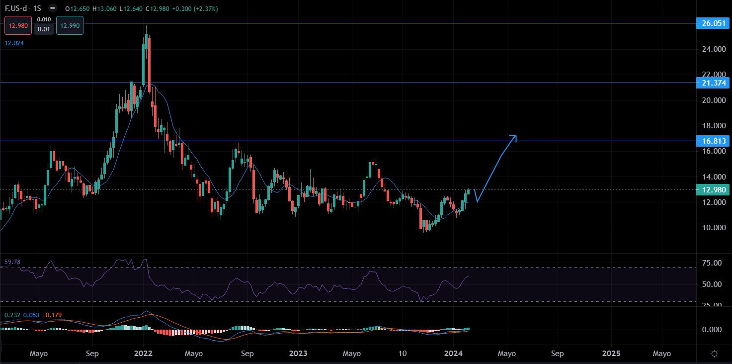 Comentario: Ford Motor presenta un mínimo de 12 meses de $9,63 y un máximo de 12 meses de $16,81. La empresa cuenta con una capitalización de mercado de 50.760 millones de dólares, una relación precio-beneficio de 11,74, una relación precio-beneficio-crecimiento de 1,07 y una beta de 1,62. Su ratio rápido es de 1,03, el ratio circulante es de 1,20 y el ratio deuda-capital alcanza 2,33.