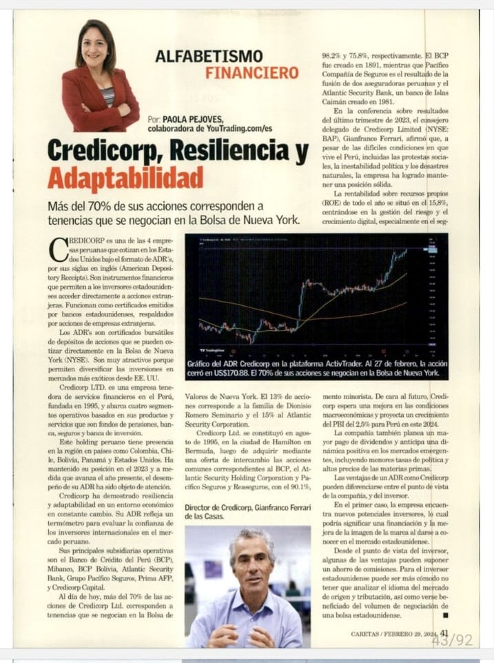Credicorp es una de 4 las empresas peruanas que cotizan en los Estados Unidos bajo el formato de ADR´s, por sus siglas en inglés: