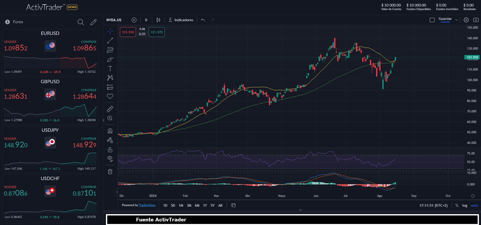 NVIDIA está mostrando señales de recuperación y podría seguir subiendo si continúa encontrando soporte en los niveles actuales. Sin embargo, es importante monitorear de cerca los niveles de resistencia alrededor de los $130, donde podría enfrentar cierta presión de venta. En caso de superarse esta resistencia, el siguiente objetivo podría ser el máximo anterior cerca de los $150.
