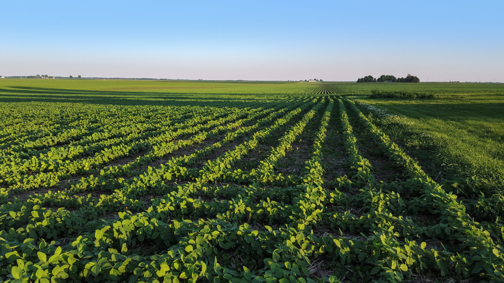 Rows of Soybean growing on a Farmer. The soybeans are in the early stages of growth photographed in mid June in Central Illinois. The photograph was taken around sunset.